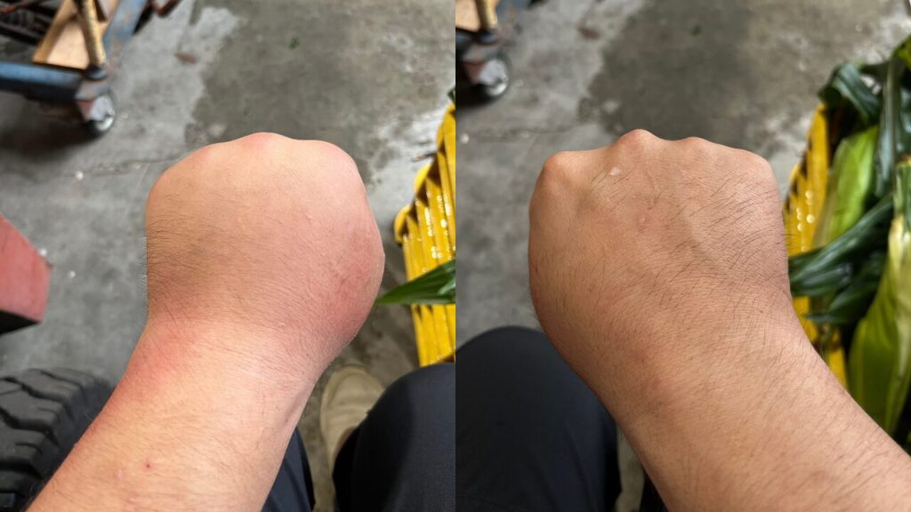上の画像はぼくが刺されたときの腫れた手や腕の画像ですが、腫れる人の場合はこの程度にはなり、皮膚はパンパンで冷やしていないと、普段の生活も大変なほどです。